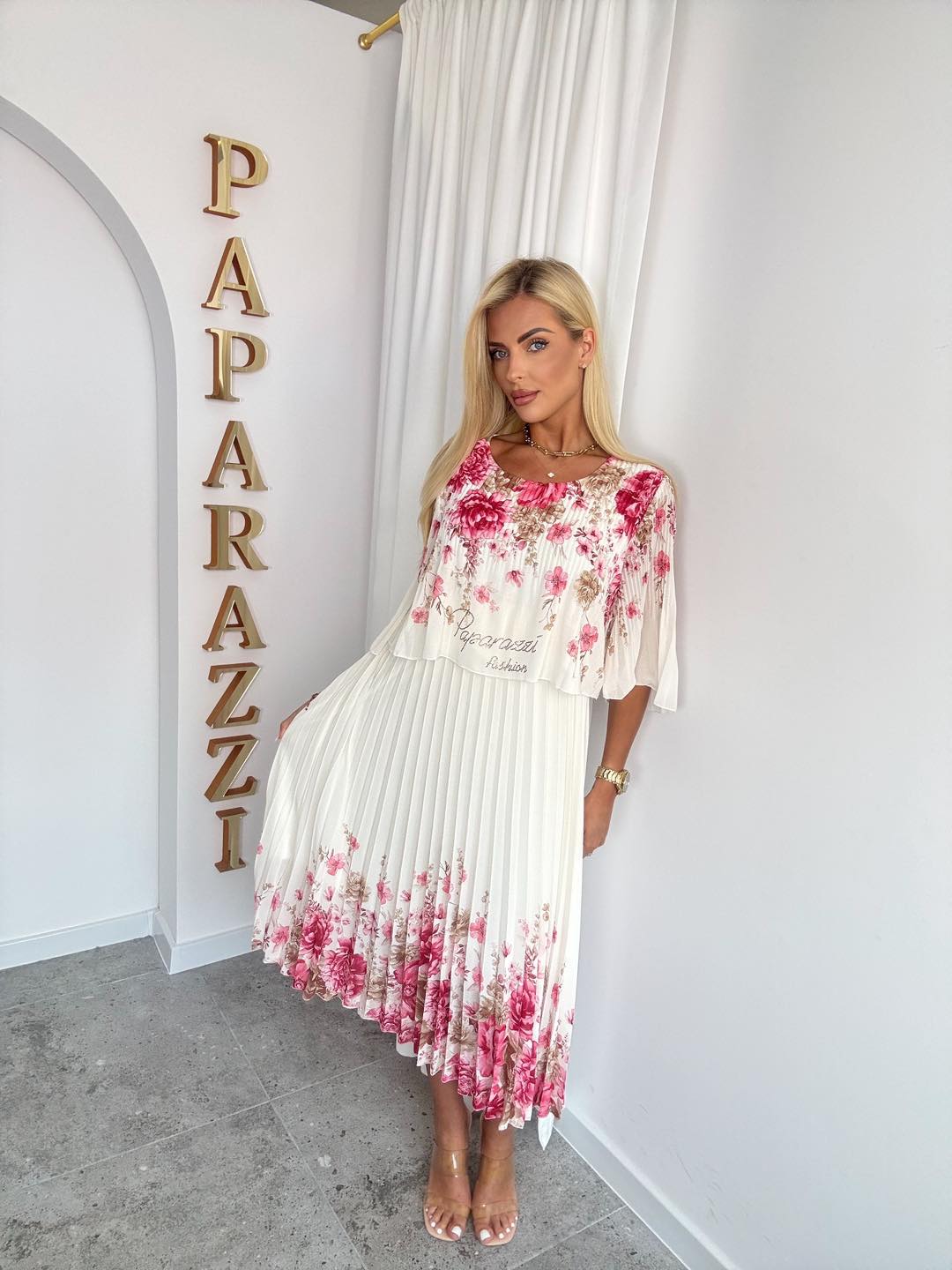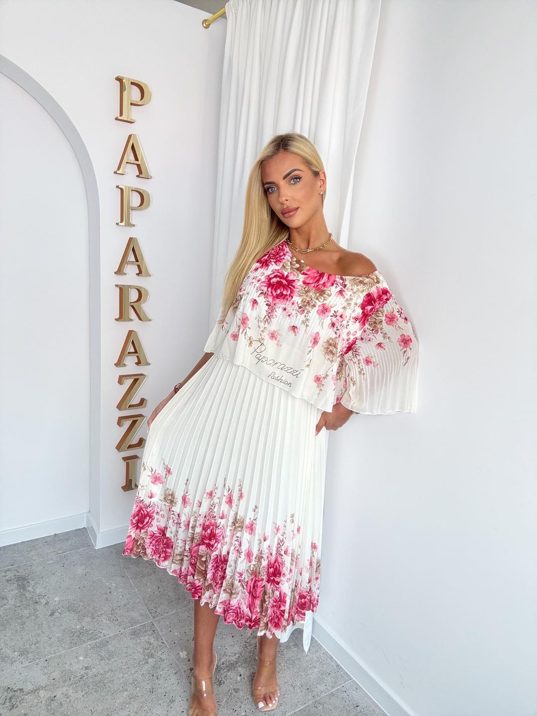 Zachwycająca, kobieca sukienka midi w subtelnym odcieniu pudrowego różu to idealna propozycja na wyjątkowe okazje. Model wyróżnia się eleganckim plisowaniem oraz efektownym, cieniowanym printem inspirowanym motywem zwierzęcym, który dodaje stylizacji charakteru. Luźny, zwiewny fason pięknie układa się na sylwetce, zapewniając komfort noszenia i swobodę ruchów. Asymetryczny dekolt odsłaniający jedno ramię podkreśla kobiecość, a szerokie rękawy nadają całości lekkości i modowego wyrazu.
