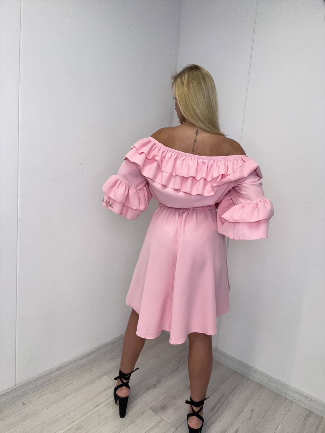 Sukienka hiszpanka – wokół dekoltu falbanki wykończone złotymi kamyczkami, rękawki zakończone również falbankami, przód delikatnie krótszy. Pasek w zestawie.