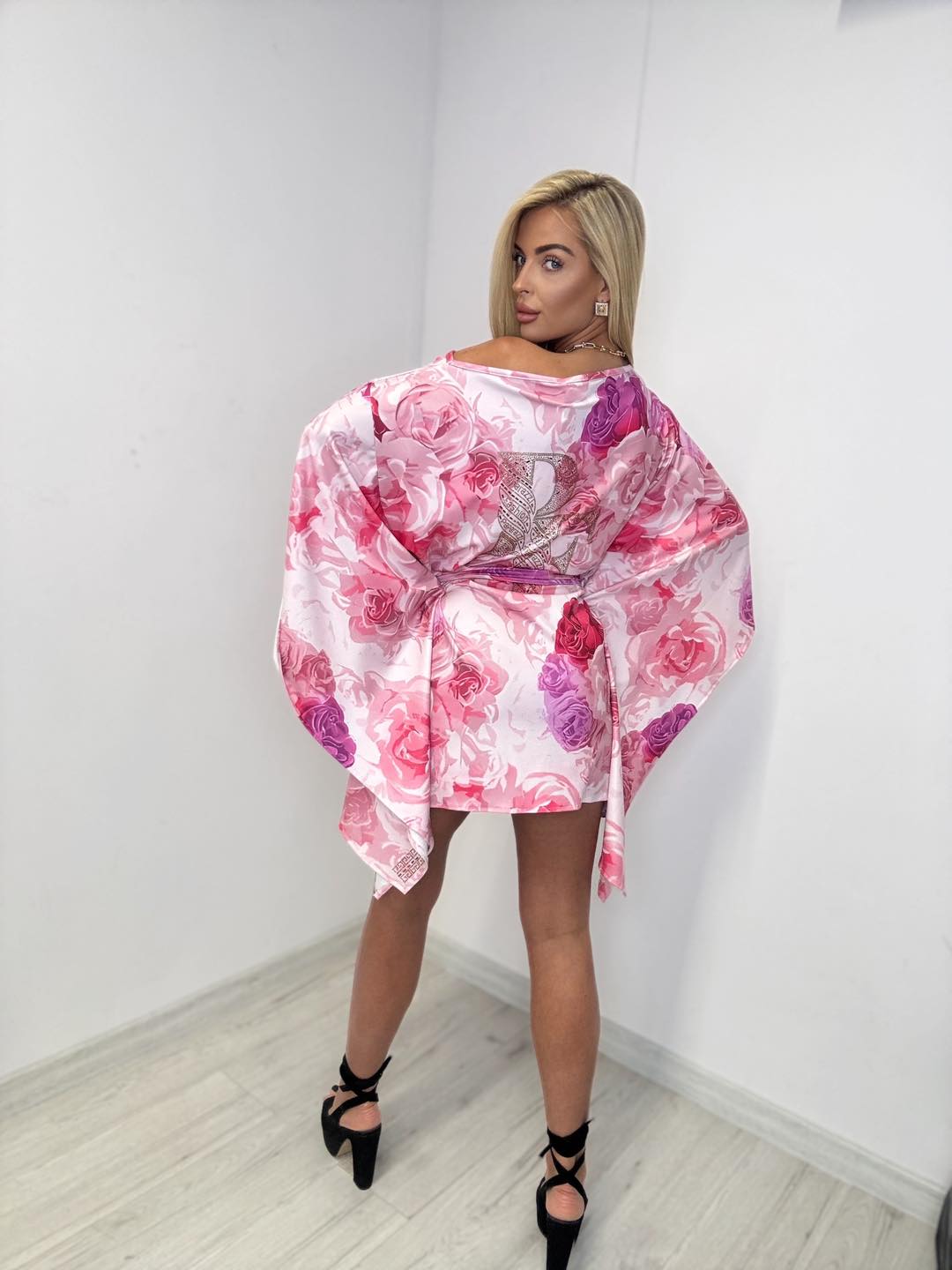 Kimonowa sukienka/tunika w efektowny różany print, w pasie zawiązywana paskiem.
