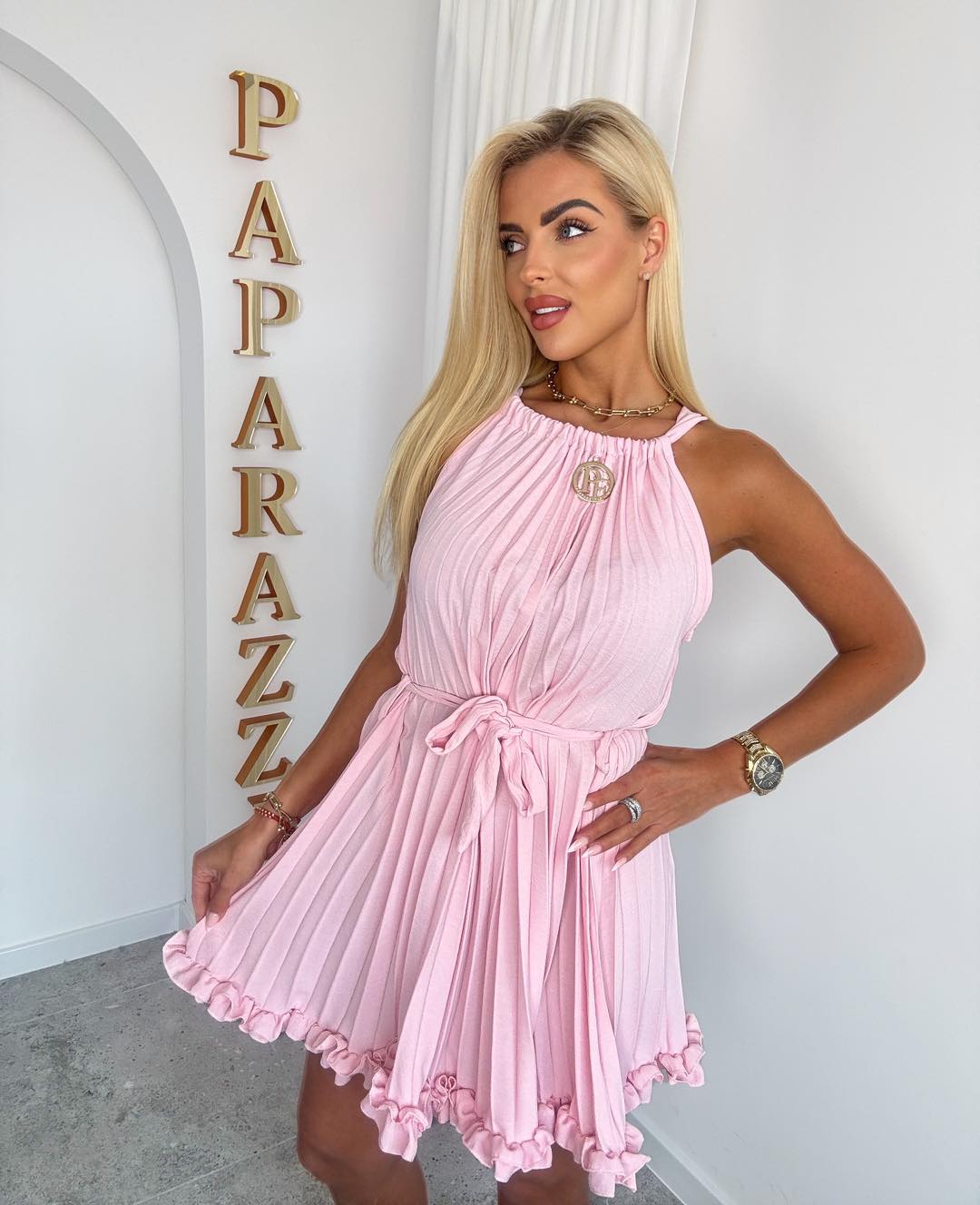 Zwiewna plisowana sukienka w odcieniu fuksji, która podkreśla kobiecą sylwetkę i dodaje lekkości. Wiązanie w talii pięknie modeluje figurę, a falbana u dołu nadaje romantycznego charakteru. Idealna na lato, randkę lub wyjątkowe okazje 💗