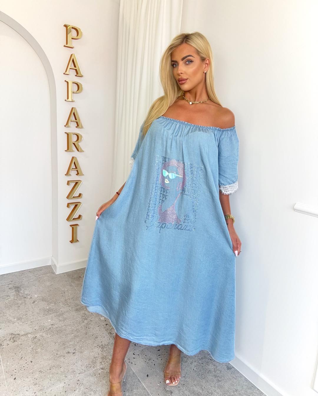 Zwiewna i niezwykle kobieca sukienka w odcieniu pudrowego różu, która zachwyca lekkością i swobodnym fasonem. Model typu hiszpanka pięknie eksponuje ramiona i dekolt, dodając stylizacji subtelnej zmysłowości. Luźny, rozkloszowany krój zapewnia maksymalny komfort noszenia oraz świetnie układa się w ruchu, tworząc efekt delikatnej, falującej tkaniny. Rękawy o długości do łokcia wykończone są ozdobną koronką, która nadaje całości romantycznego charakteru. Na froncie znajduje się modny nadruk, który przyciąga uwagę i podkreśla unikalny styl sukienki. Długość midi sprawia, że model jest niezwykle uniwersalny – idealny zarówno na letnie spacery, wakacyjne wyjazdy, jak i spotkania w gronie przyjaciół. Doskonale komponuje się z sandałkami, klapkami czy espadrylami, tworząc lekkie i stylowe stylizacje. Rozmiar: Biust:70-75×2 Pas:75×2 Biodra:80×2 Długość:114cm
