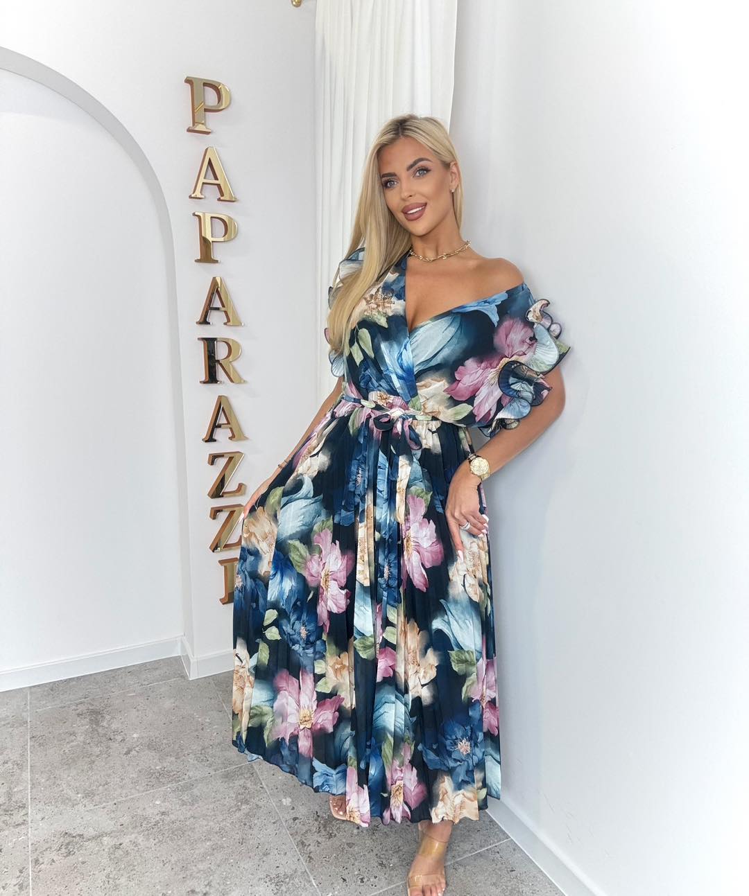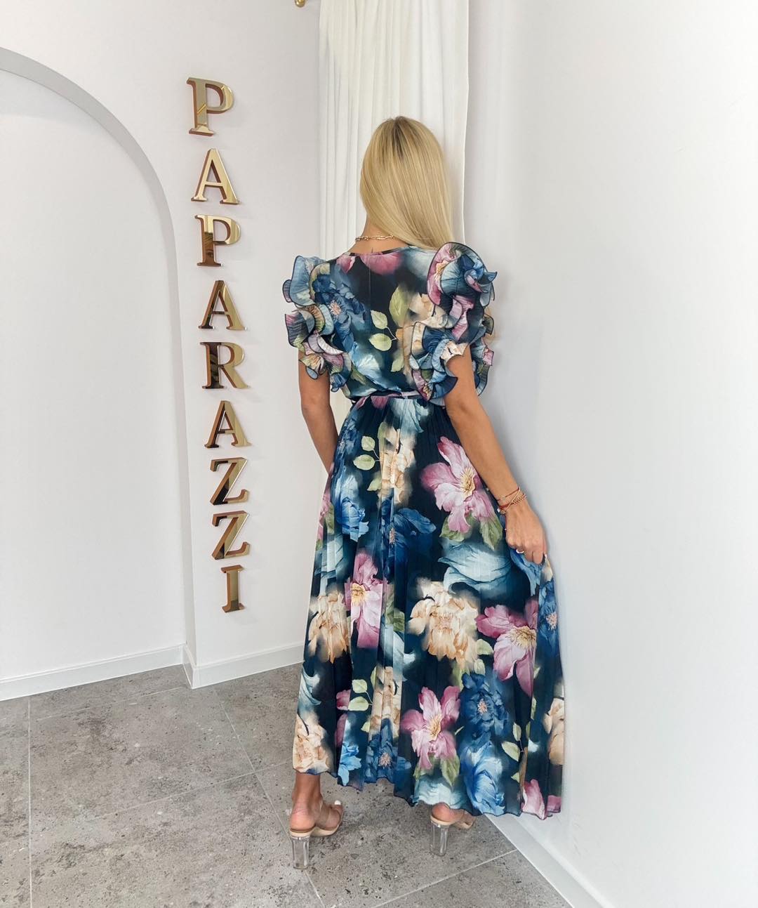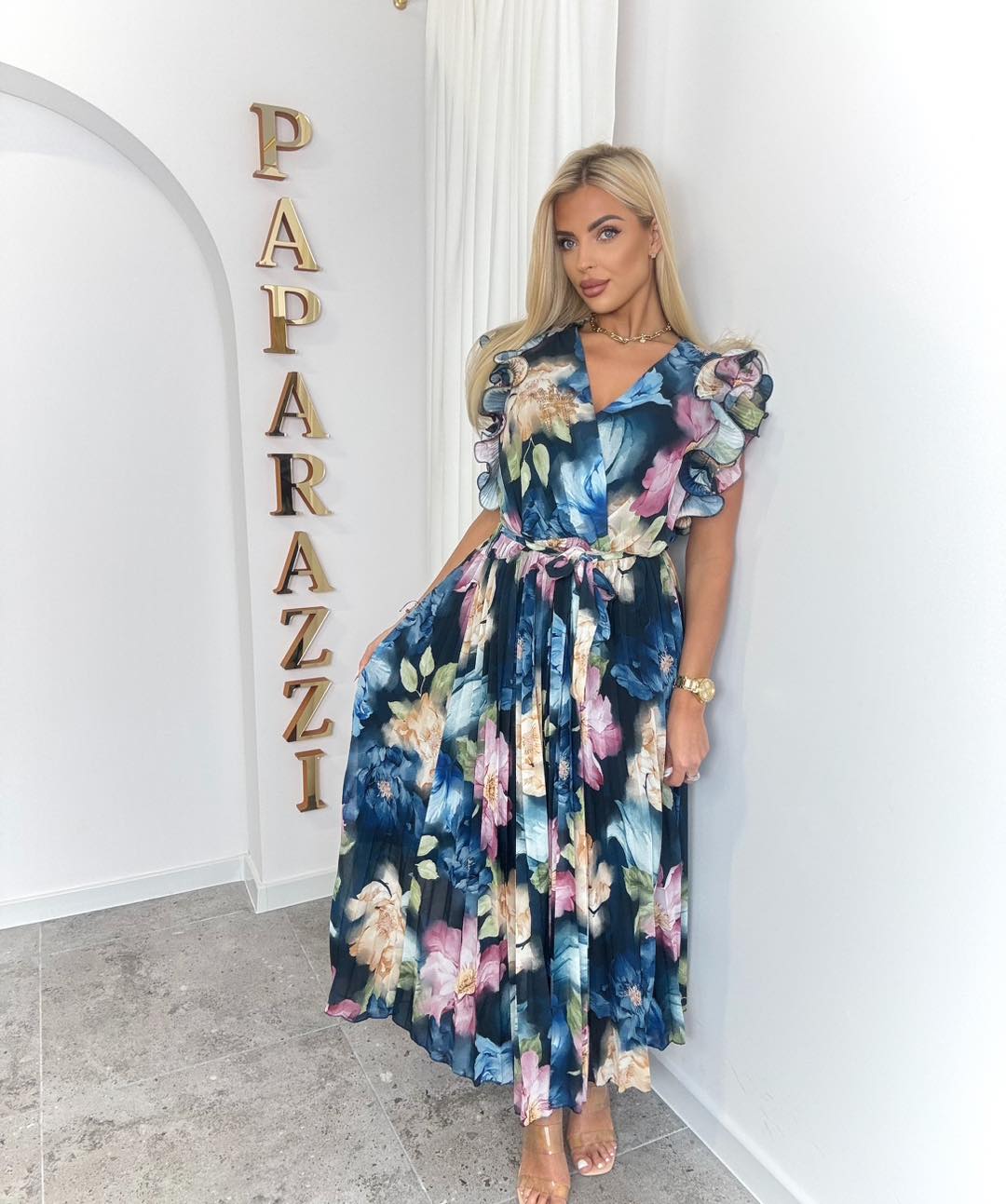 Elegancka, zwiewna sukienka midi z efektownym, kwiatowym printem w głębokich odcieniach. Model z kopertowym dekoltem i falbaniastymi rękawami, które dodają lekkości i kobiecego uroku. W talii wiązany pasek podkreślający sylwetkę, a plisowany dół …
