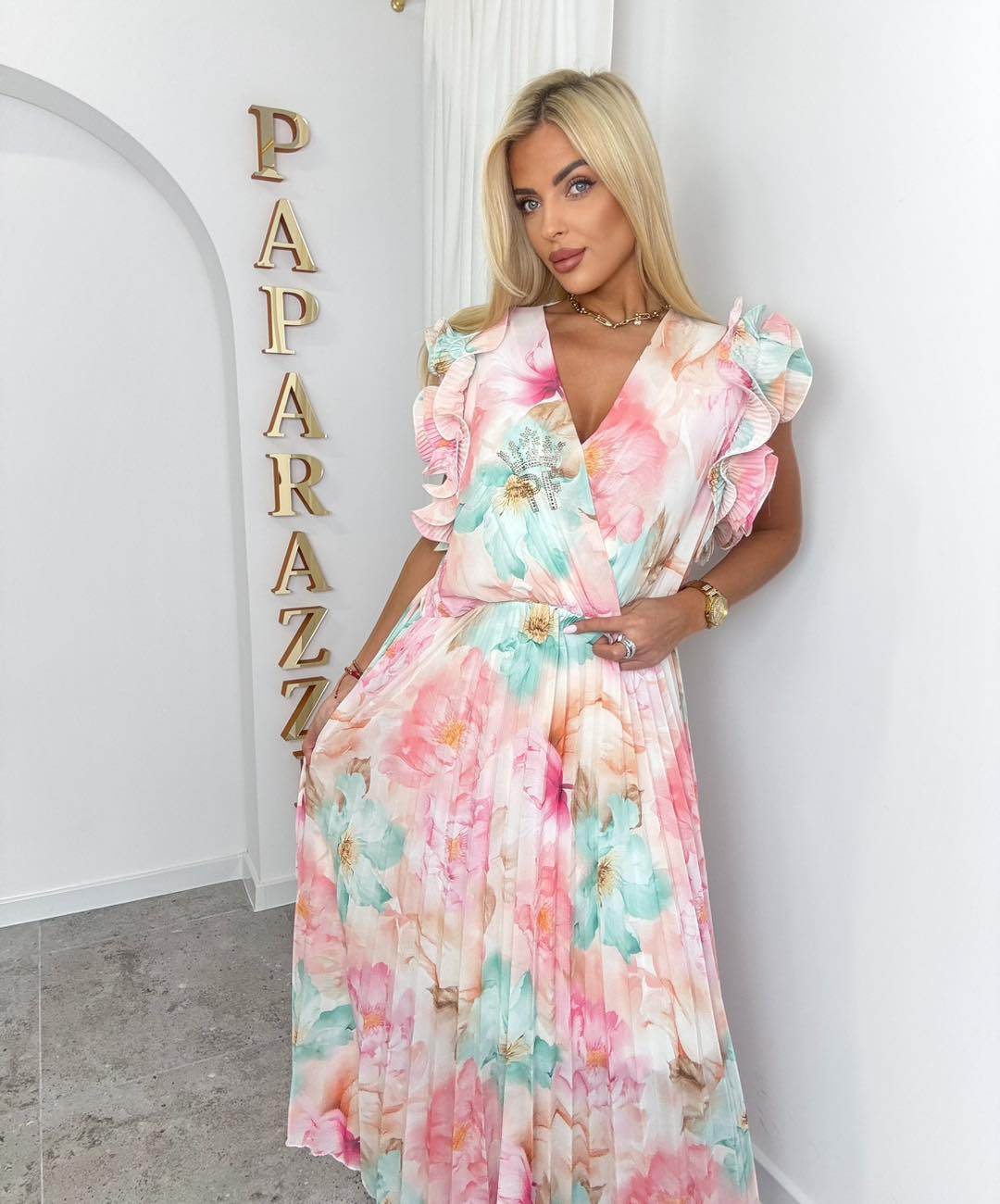 Elegancka, zwiewna sukienka midi z efektownym, kwiatowym printem. Model z kopertowym dekoltem i falbaniastymi rękawami, które dodają lekkości i kobiecego uroku. W talii wiązany pasek podkreślający sylwetkę, a plisowany dół pięknie układa się w …