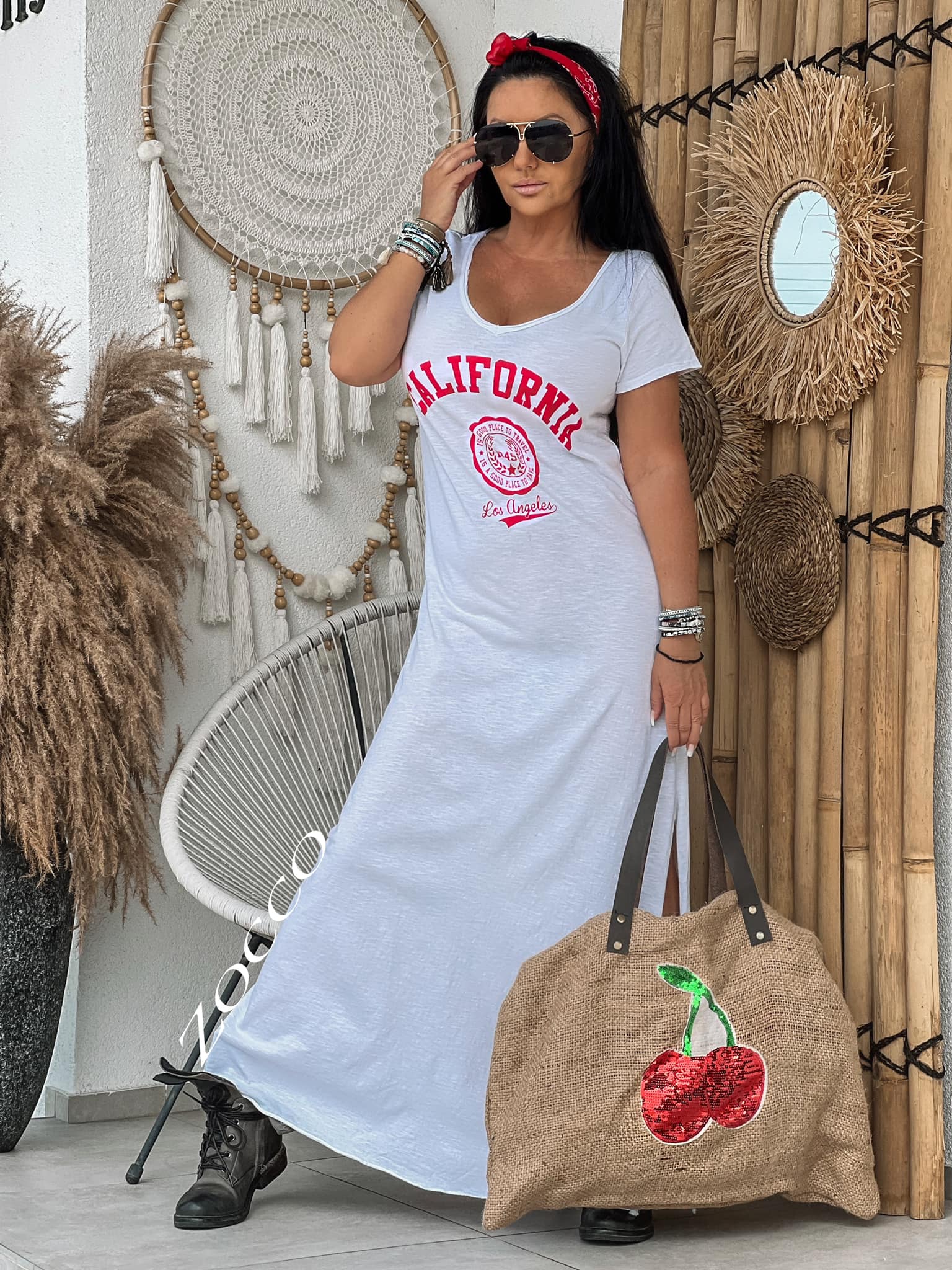 Długa ,bawełniana, prosta, wygodna sukienka z nadrukiem z przodu, dekolt w szpic.na dole rozporek. Rozmiar: Biust:50-54x2 Pas:50-54x2 Biodra:54-60x2 Długość;140cm Skład: Bawełna 100%