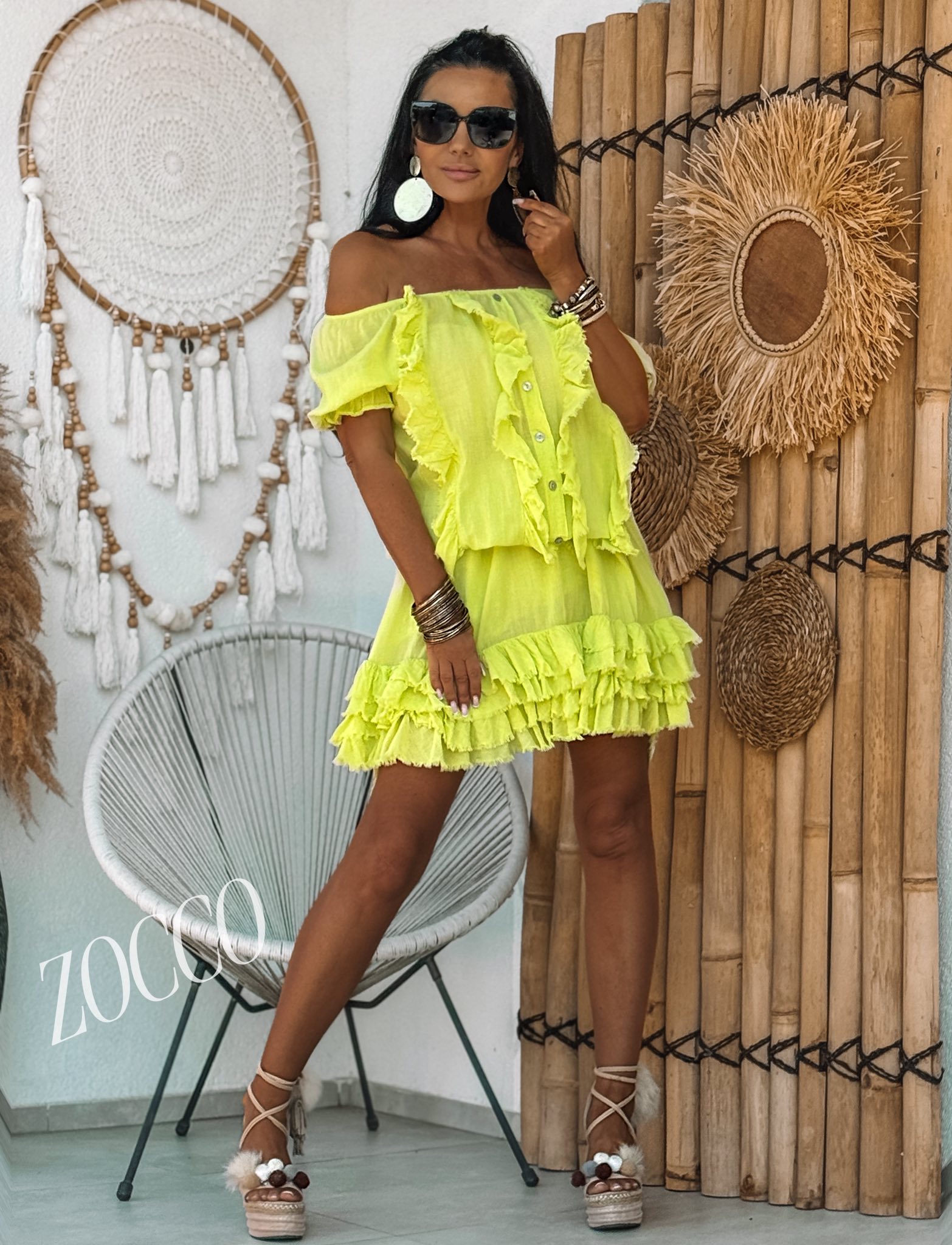 Sukienka hiszpanka w drobne falbanki, pas na gumce, długość jest regulowana, posiada podszewkę. Rozmiar: Biust:60 x2 Pas:35-60x2 Długość:108 cm