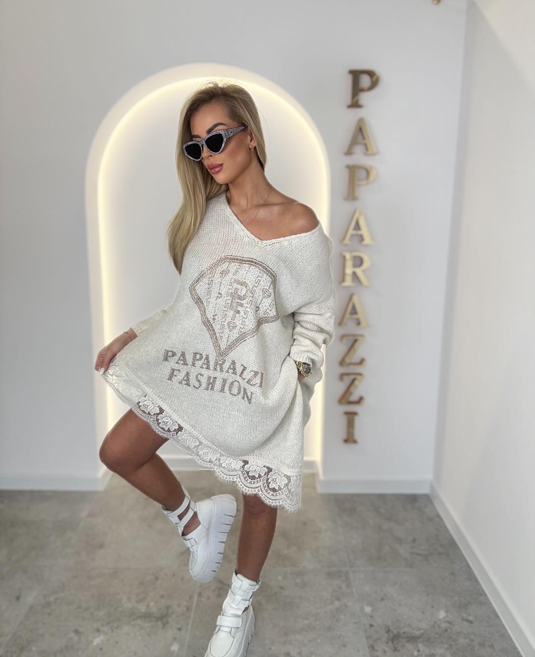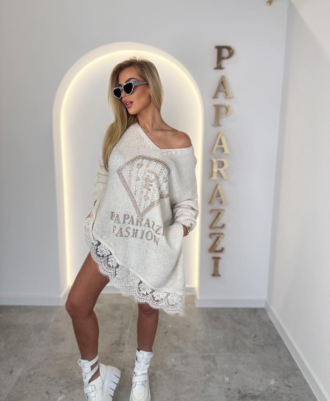 Asymetryczny sweterek z dekoltem w szpic ze złotym diamentem, zakończony koronką.