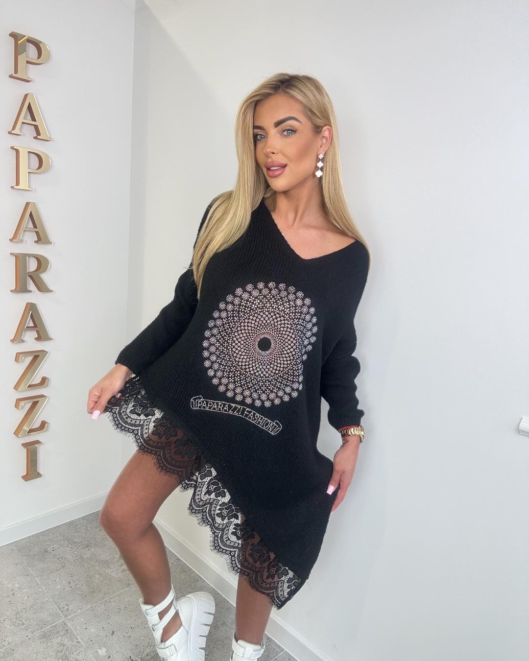 Asymetryczny sweterek z dekoltem w szpic z dekoracyjną aplikacją, zakończony koronką.