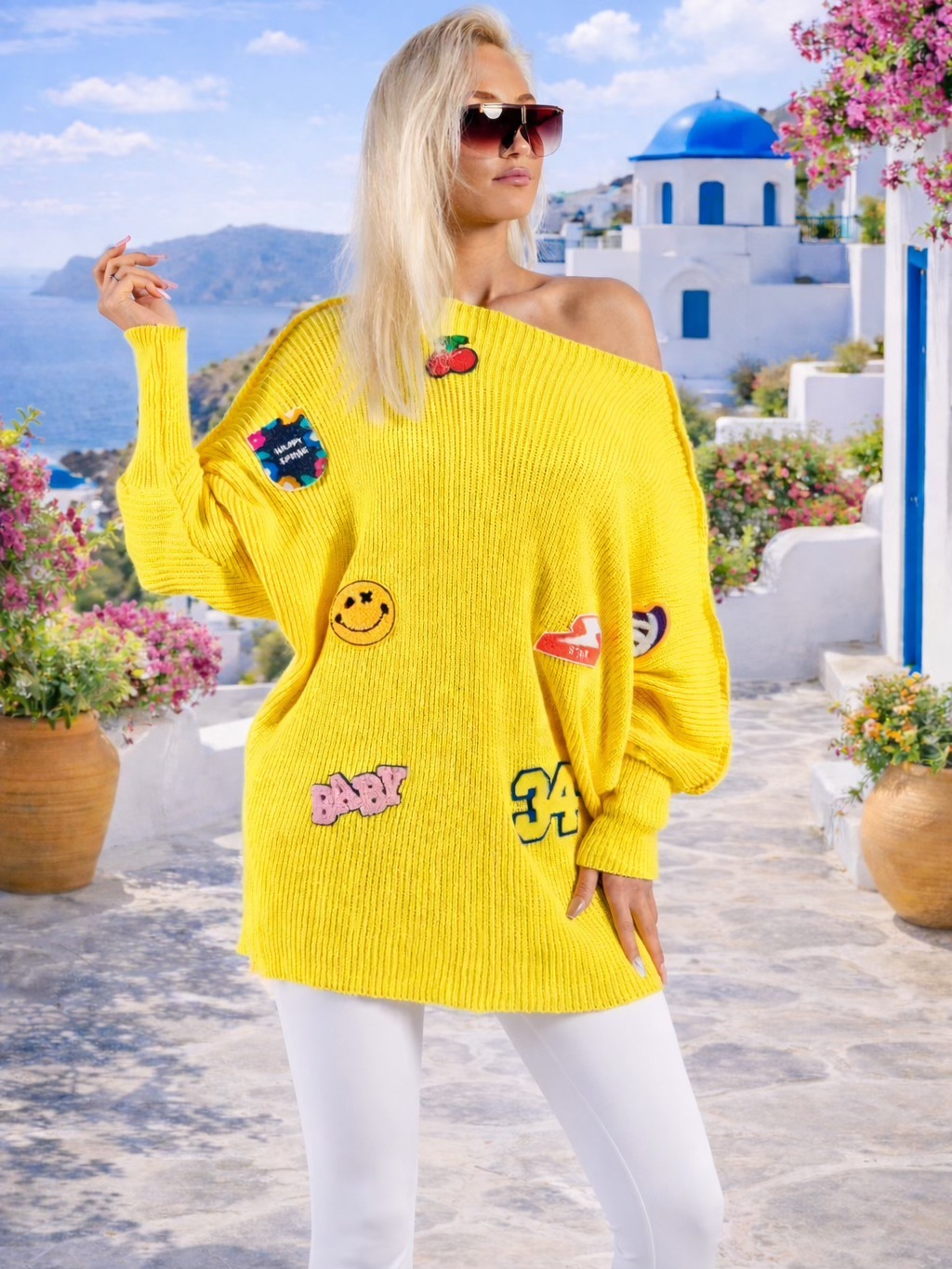 Dłuższy sweterek z licznymi naszywkami.