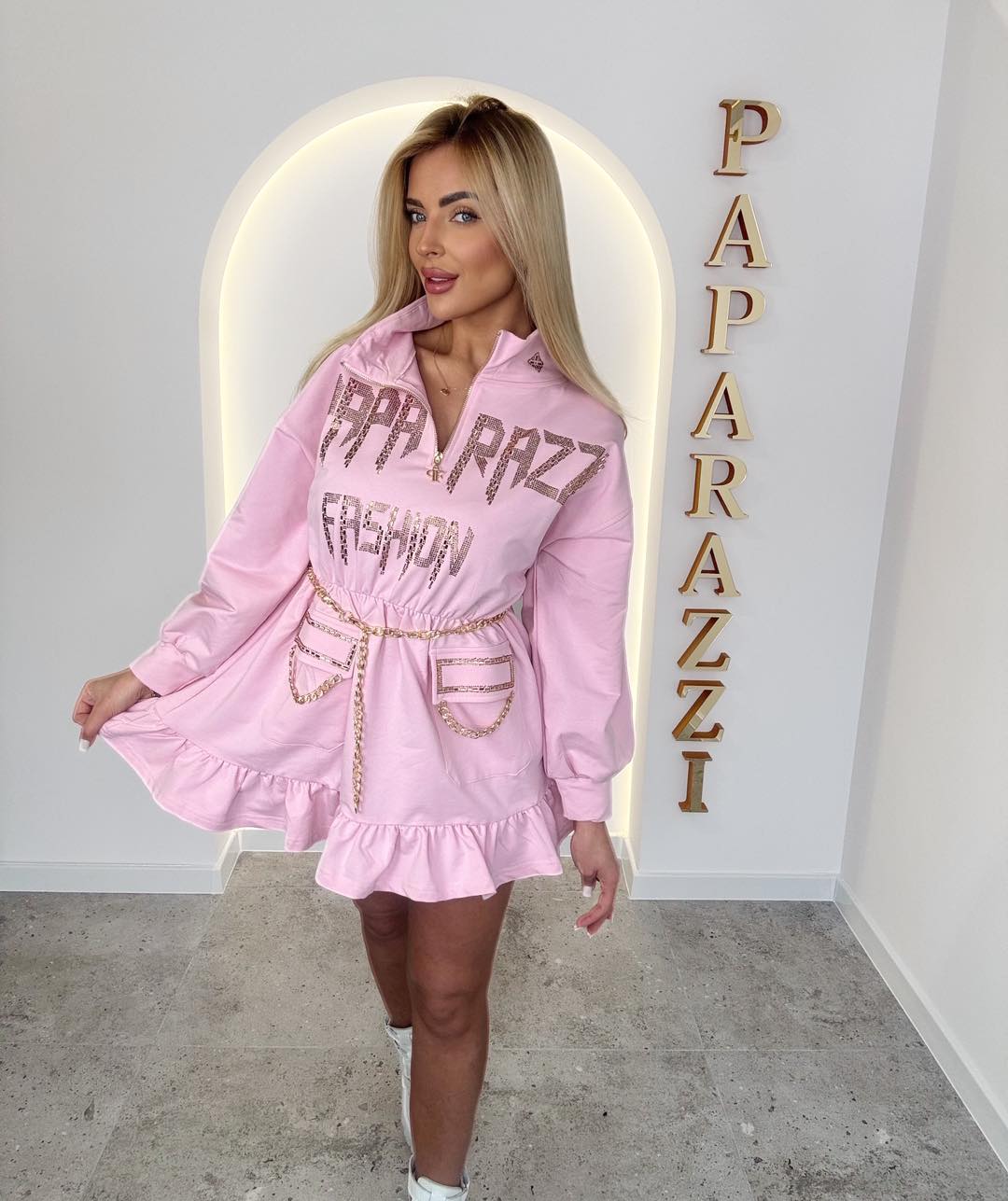 Sukienka/tunika z długim rękawem oraz rozpinanym półgolfem. Bogate złote zdobienia w postaci łańcuszków i kamyczków tworzą nowoczesny i niepowtarzalny styl.