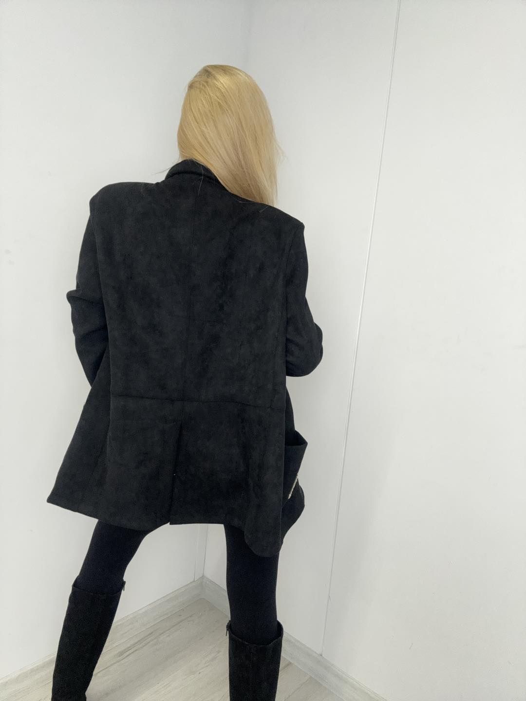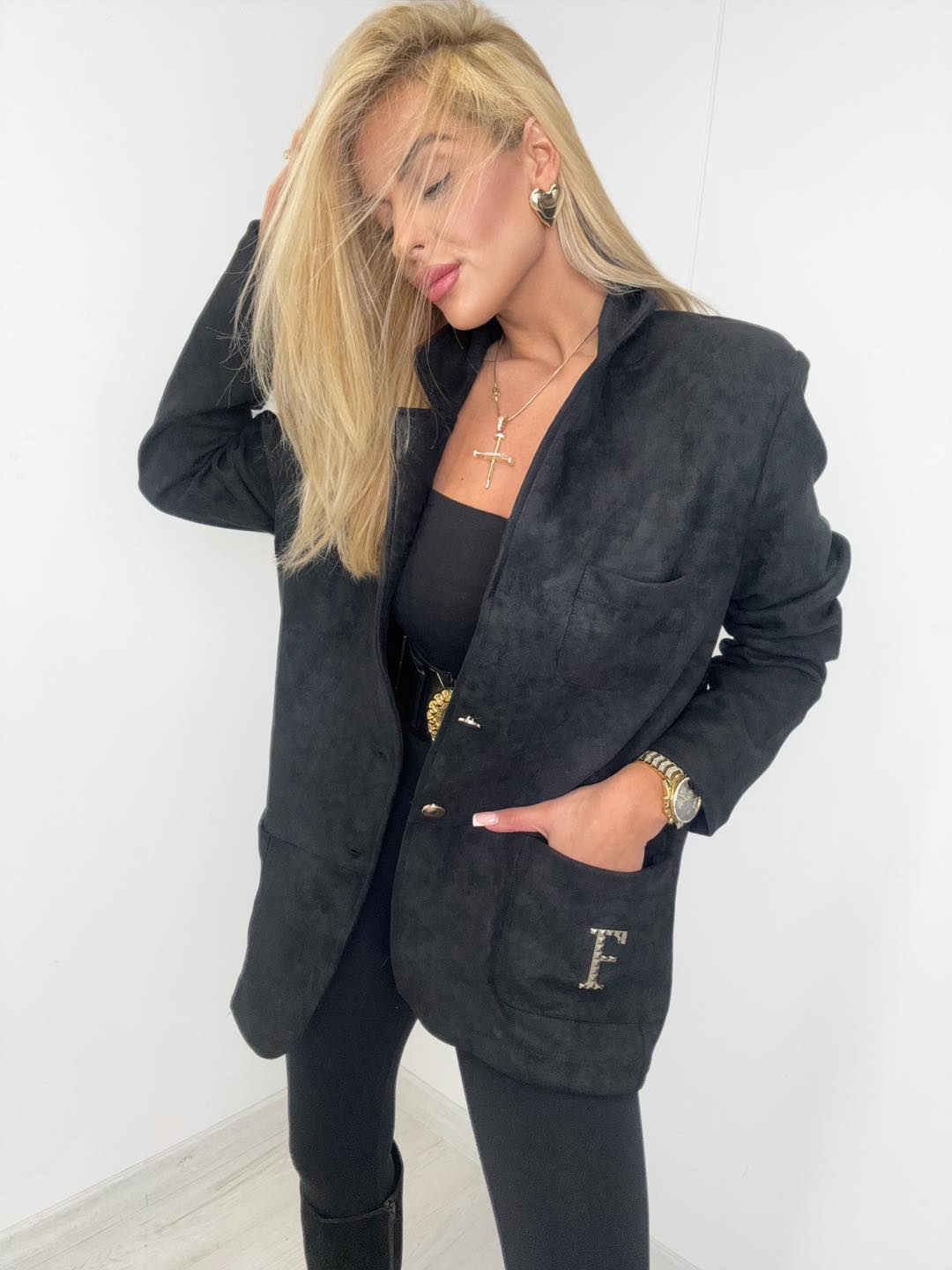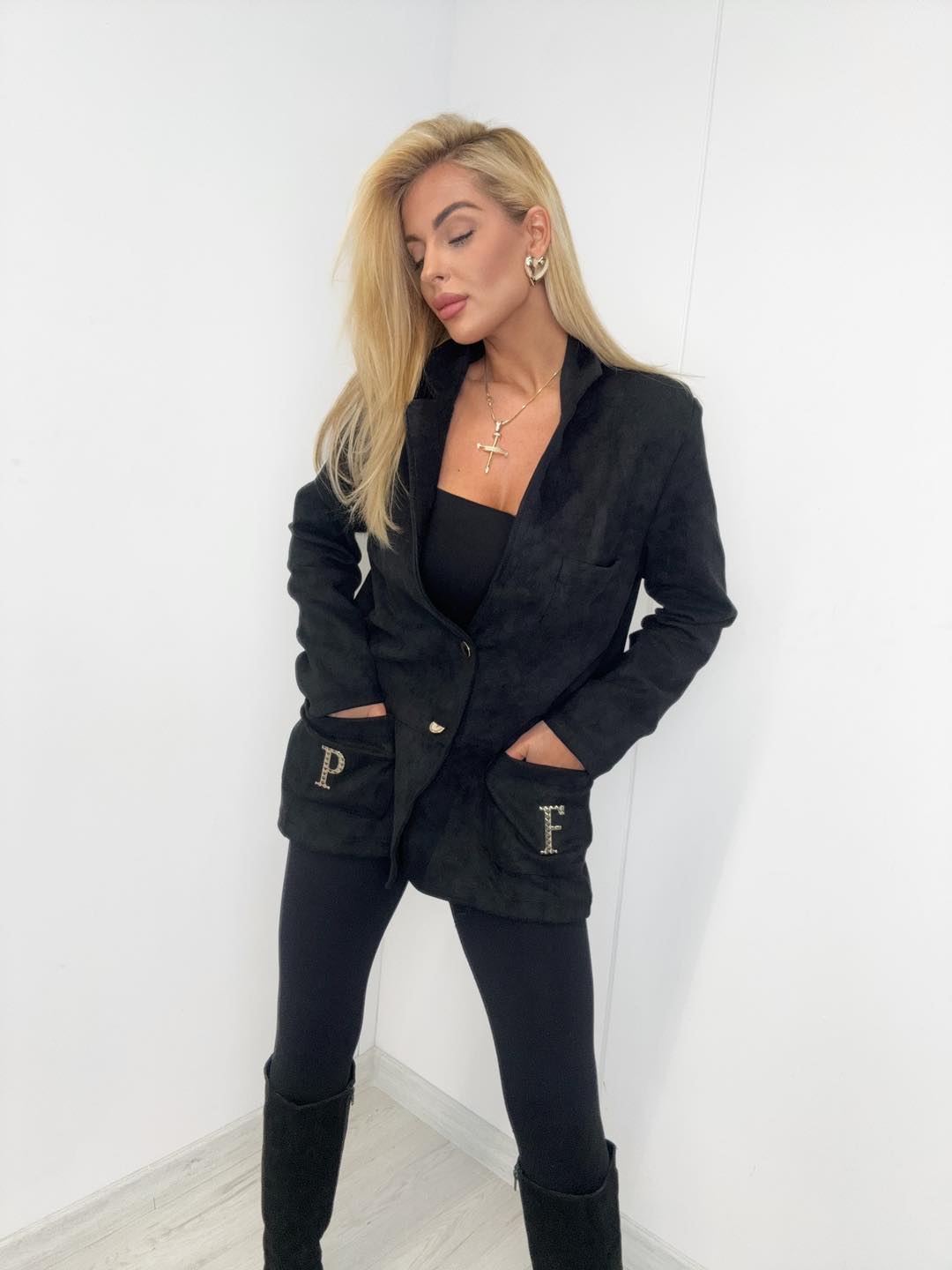 Piękna marynarka zamszowa ,zapinana na dwa guziczki ,z przodu na kieszeniach złote literki ,z tyłu delikatny mały rozporeczek.